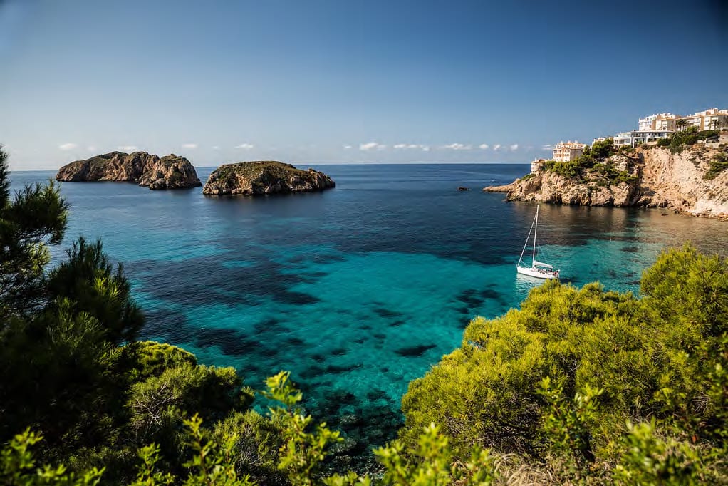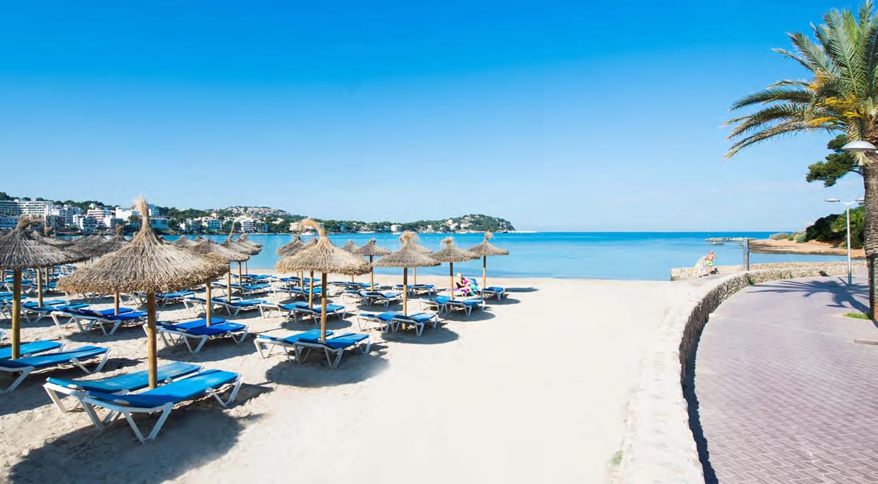 La playa de Santa Ponça, de 900 metros de largo y 50 metros de ancho, se encuentra en el suroeste de Mallorca. Situada en el popular destino turístico de Santa Ponça, la playa está delimitada por dos promontorios rocosos que se adentran en el mar y forman la bahía de Cala Santa Ponça. Gracias a su ubicación resguardada y a la escasa corriente, esta luminosa playa de arena blanca es ideal para familias con niños.